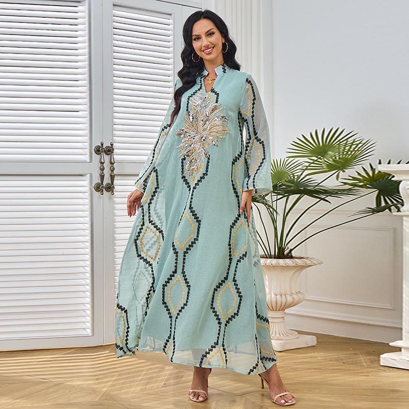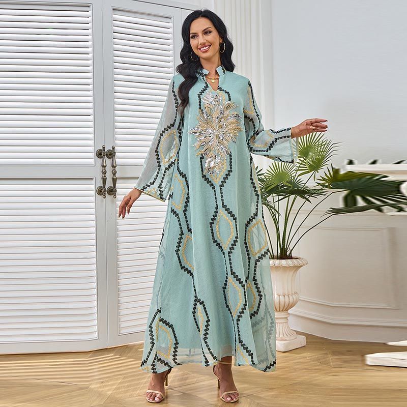 To elevate your ensemble, consider accessorizing with statement jewelry and a chic clutch, allowing the Dubai Women's V-Neck Robe Dress to be the centerpiece of your outfit. Regarding care, we recommend hand-washing or using a delicate cycle in cold water to maintain the quality of this beautiful dress and keep the sequins sparkling.