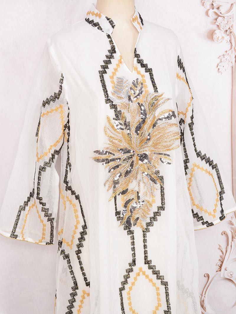 The Dubai Women's V-Neck Robe Dress features a stylish V-neckline that beautifully frames the face while offering a flattering silhouette. Crafted with meticulous attention to detail, this robe dress is accentuated by shimmering sequin embellishments that catch the light and enhance your overall look. Its flowing fabric drapes elegantly and ensures that you feel both comfortable and chic.