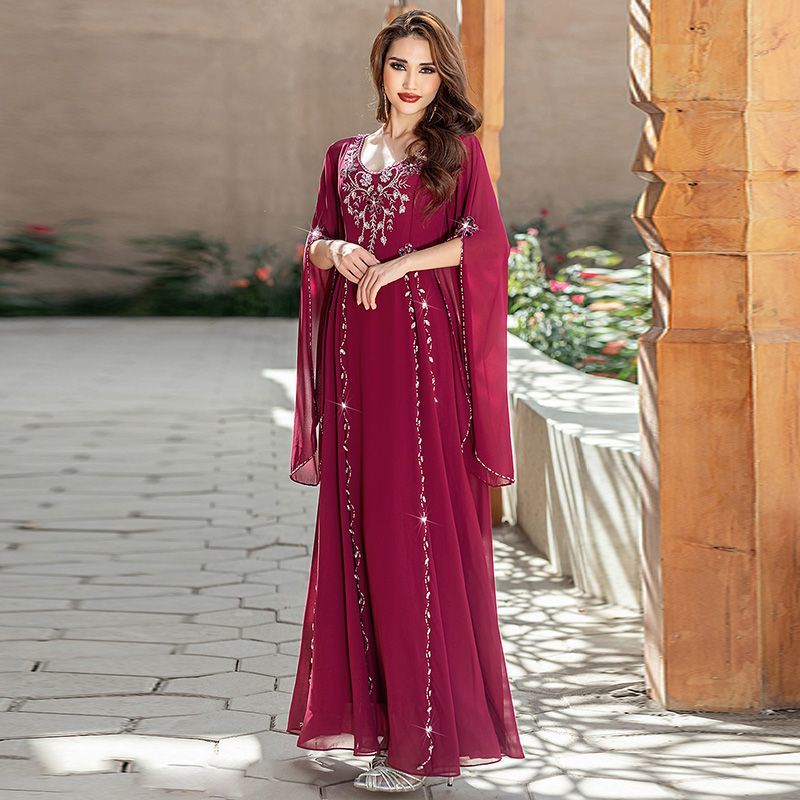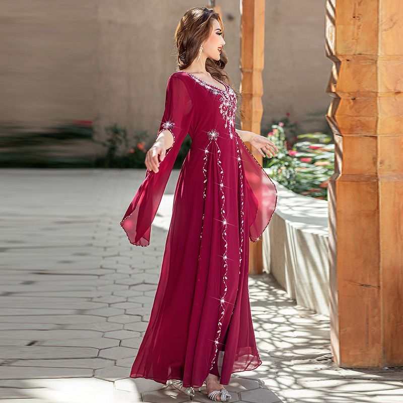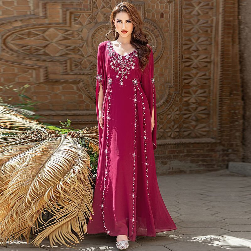 Middle East Dubai Burgundy Handmade Beaded Dress - Ladies Summer Celebrity V-Neck Arabian Robe