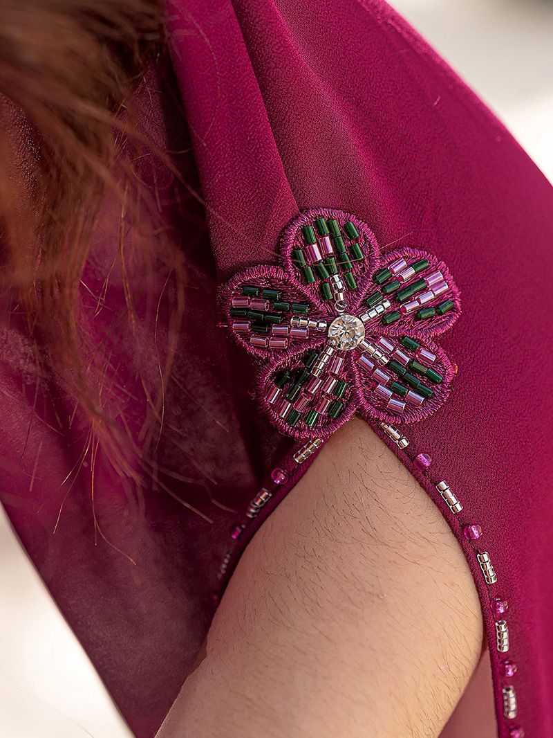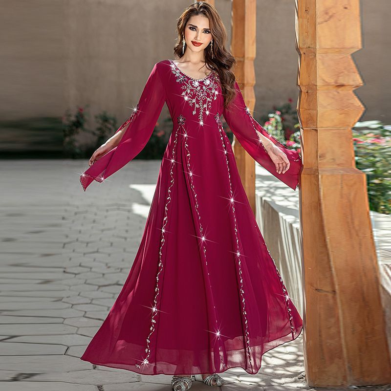 Introducing the stunning Burgundy Handmade Beaded Dress, a true masterpiece inspired by the rich cultural heritage of the Middle East. This exquisite ladies' summer celebrity V-neck Arabian robe is designed not just to make a statement but to envelop you in a world of luxury and charm. Handcrafted with meticulous attention to detail, each bead and stitch tells a story of elegance and sophistication, making it the perfect addition to your wardrobe.