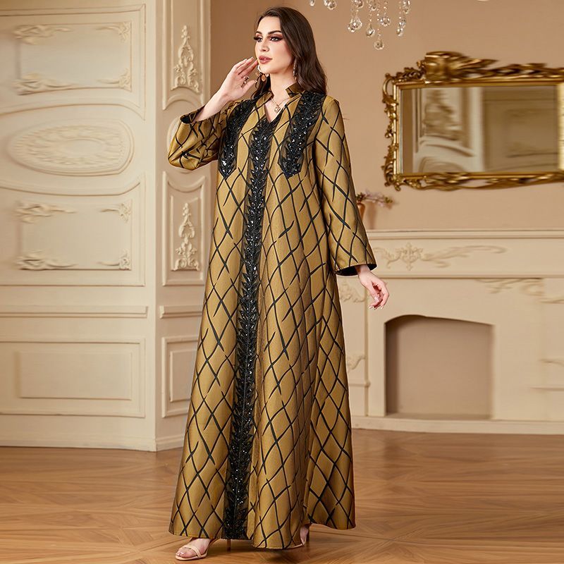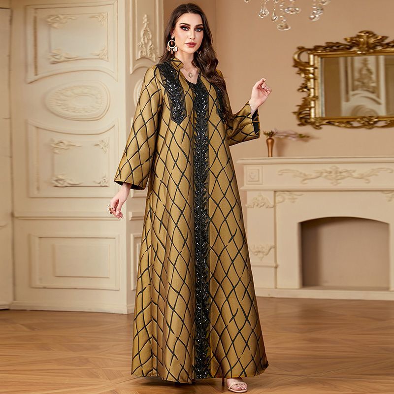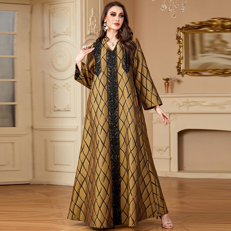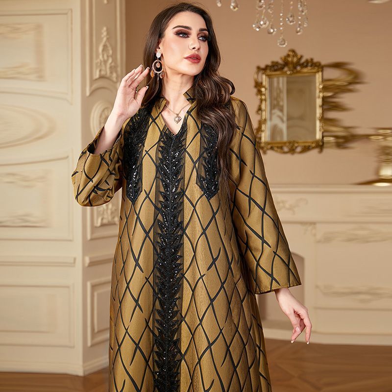Middle East V-neck Long Dress - Ethnic Jacquard Loose High-End Robe for Dubai Vacation