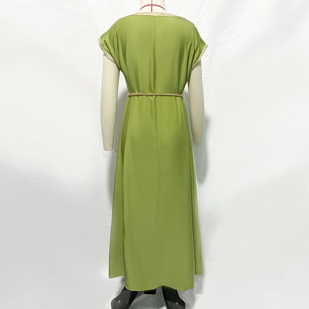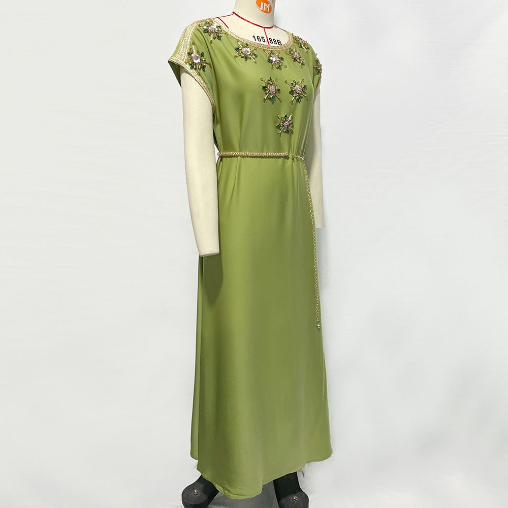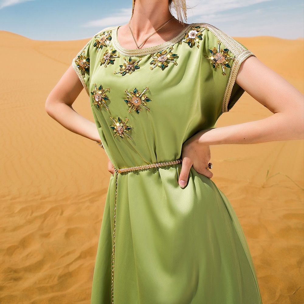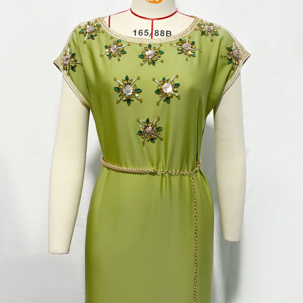 Introducing our exquisite Middle Eastern High-End Dress, a stunning embodiment of luxury and sophistication. Crafted from lush avocado green satin, this dress features intricate hand-sewn diamonds that add an unmatched sparkle, making it the perfect choice for those special occasions where you want to turn heads.