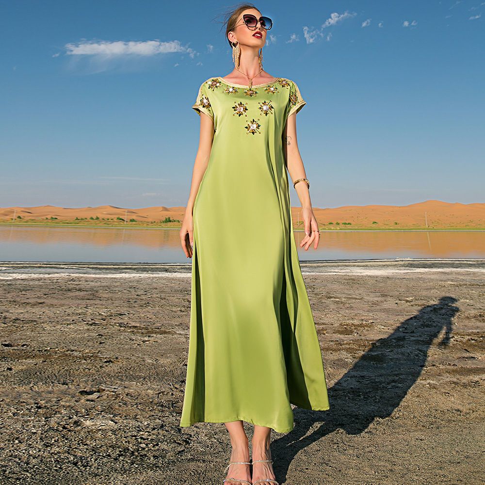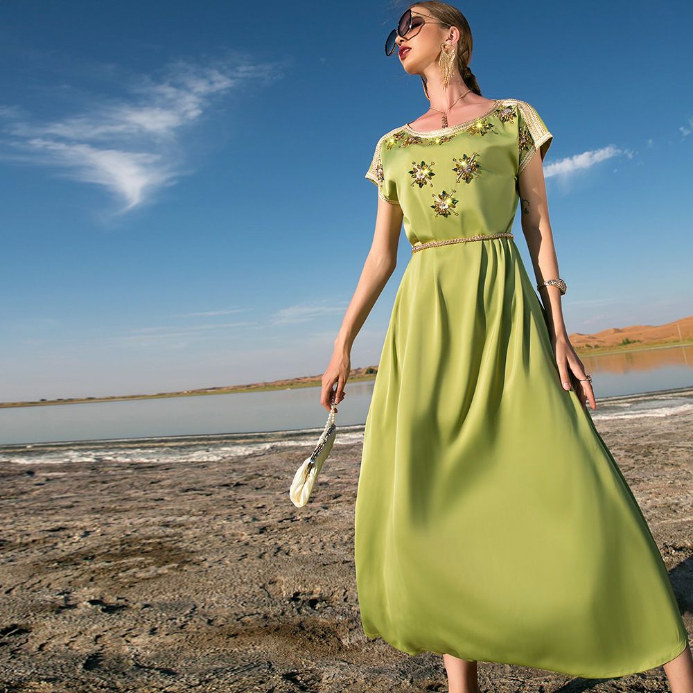 Middle Eastern High-End Dress - Avocado Green Satin with Hand-Sewn Diamonds Dubai Celebrity Robe