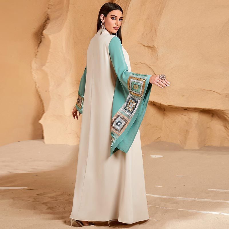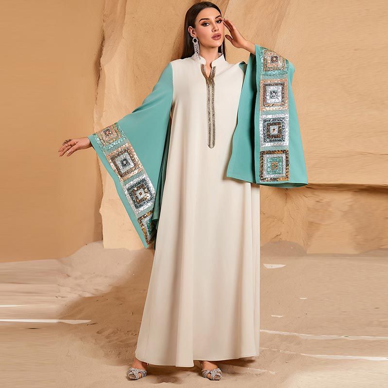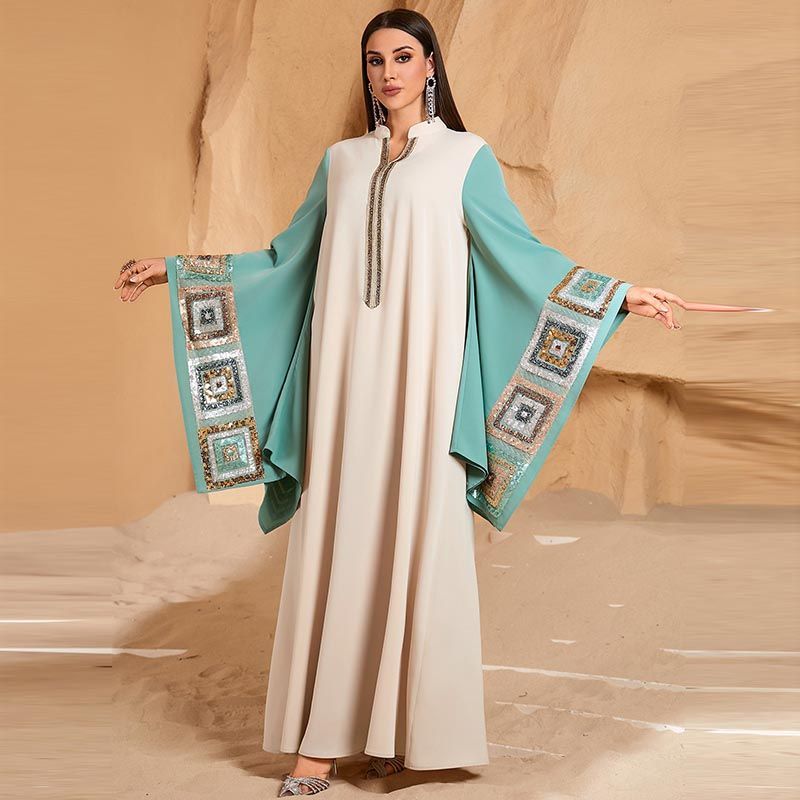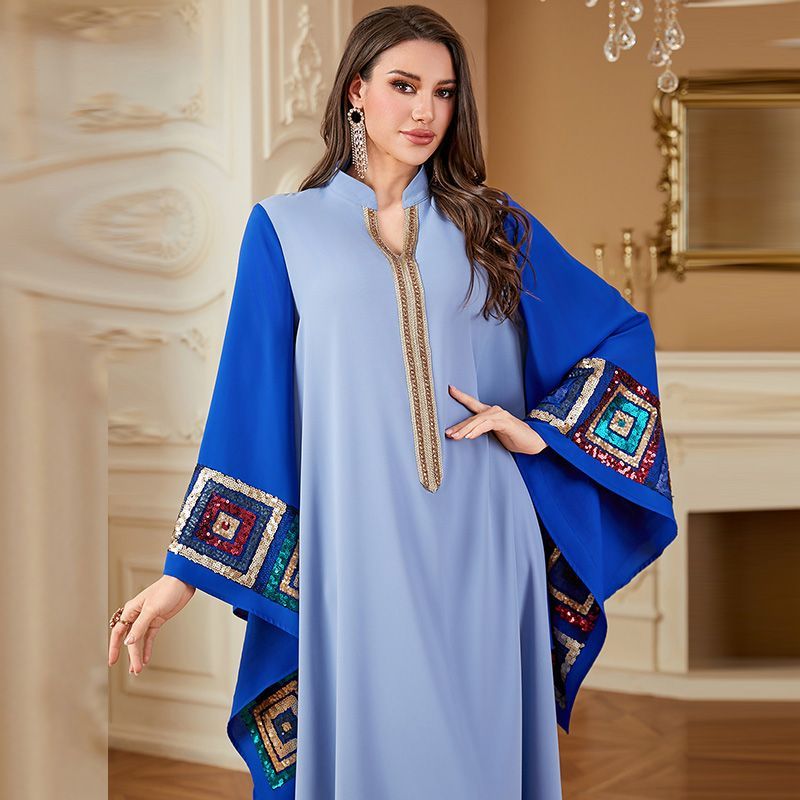 Saudi Arabia Plus Size V-Neck Robe Dress for 100kg Fat Women, Dubai Contrasting Color Bat Sleeve Dress