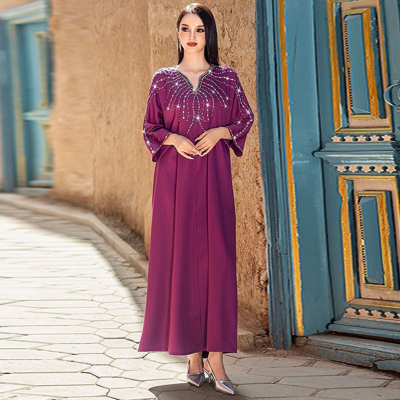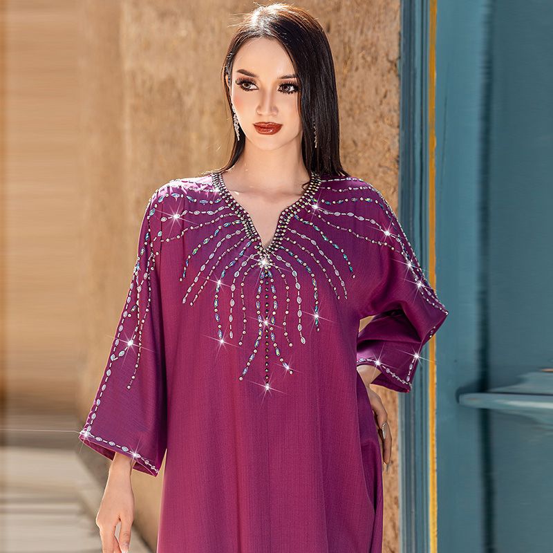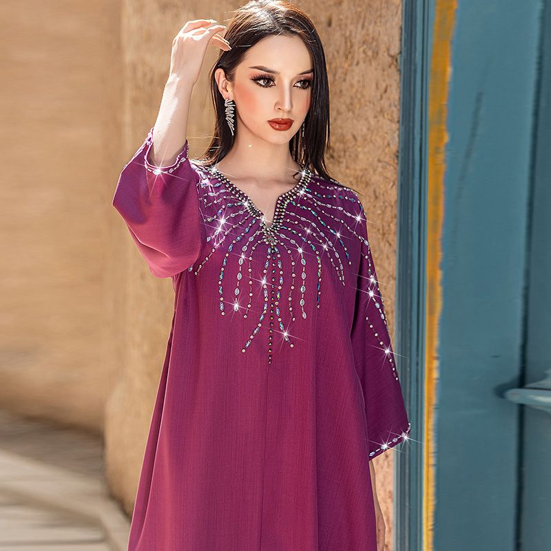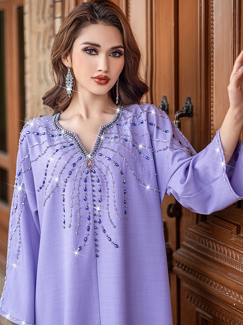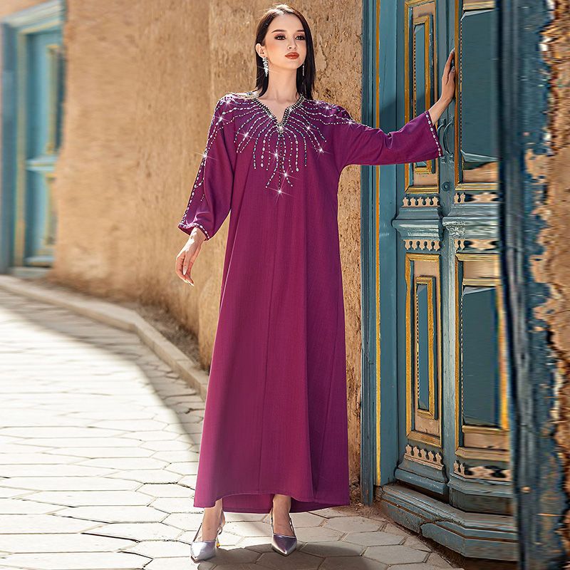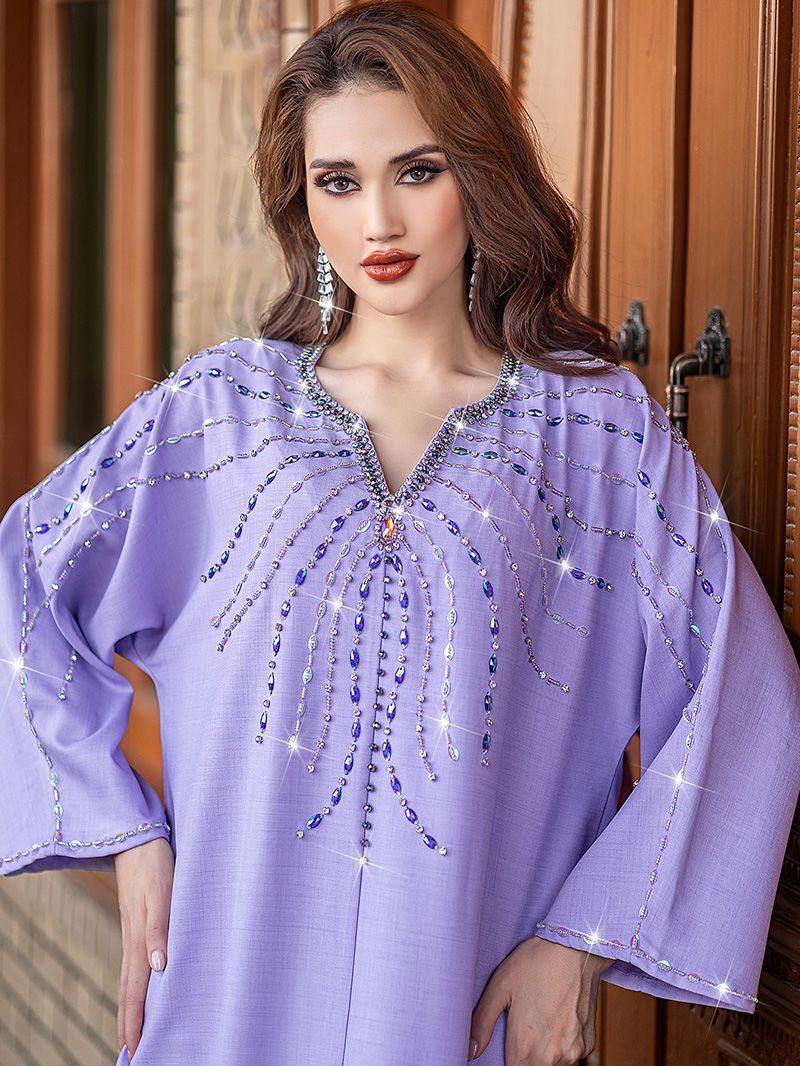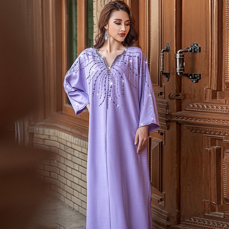 Turkey Dubai Lilac Purple Celebrity Style Long Sleeve Dress Xinjiang Women's Handmade Sewn Rhinestone Malay Robe