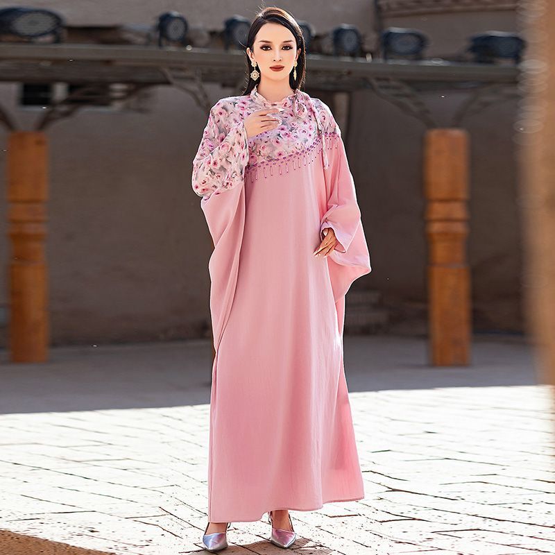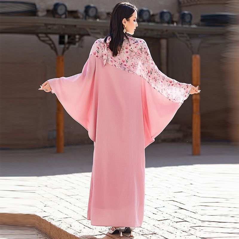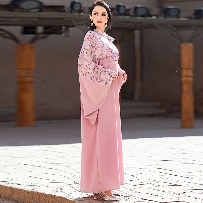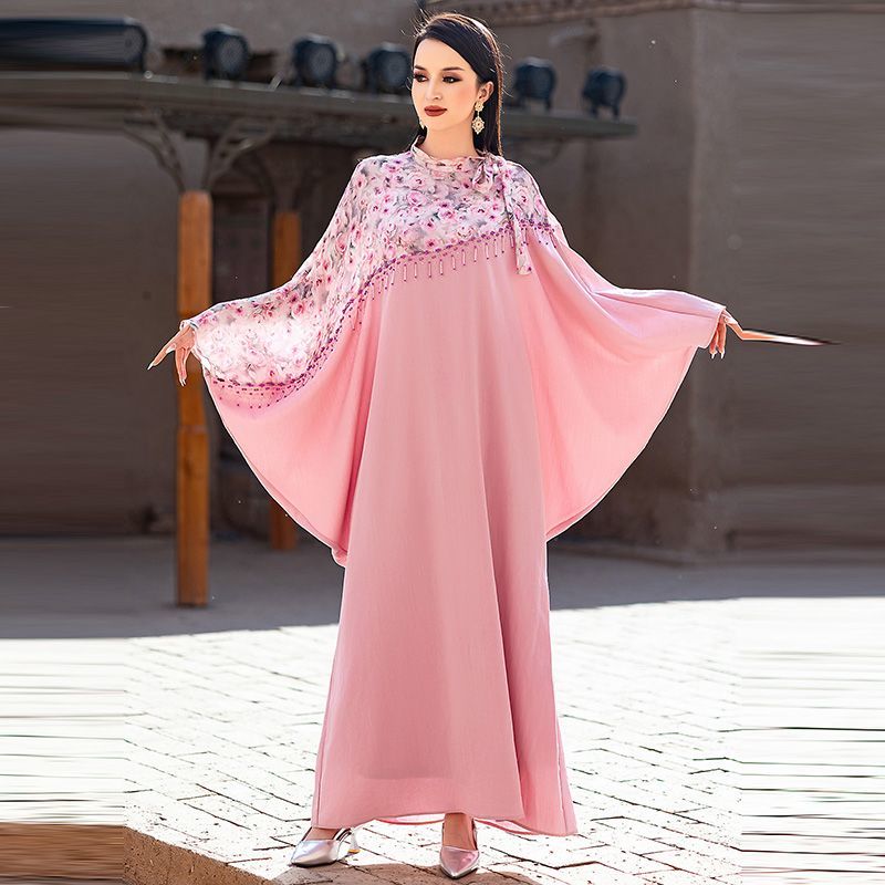 Turkey Dubai Pink Printed Bat Sleeve Dress Summer Women's Upscale Beaded Arabian Holiday Robe middle
